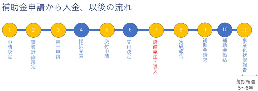 ものづくり補助金申請は公募開始から申請書提出締切日までに、公募要領で要求されている書類を提出して申請を完了します。申請後4カ月くらいかけて、事務局で書類内容を審査し、ものづくり補助金政策と合致しており、補助金を交付するに値する事業かどうかが判断され、補助金を拠出しべき事業者に対して採択結果を通知します。採択された事業者は正式見積書を入手して交付申請を実施、最終的に事務局が承認すれば交付決定となり、この決定通知が為された以降に実際に機器発注や専門家への発注できます。交付決定前に発注したものは補助金対象外となりますので、注意が必要です。交付決定後に、機器などを発注し、実際に機器を導入してから補助金申請書に掛かれた事業を開始するための体制を構築していきます。これを補助事業と呼びます。この補助事業が完了した後に、機器導入写真や機器代金の支払い証明、更に補助事業中に実際に新規事業を開始するにあたって準備したことを、補助金申請書を元に報告します。これが実績報告書です。交付決定から一定期間内に補助事業が完了していなければ遂行状況報告書が求められます。実績報告書の内容を事務局で確認し書類上の確認を終えた後に、実際に審査員が企業を訪問して補助事業の実施状況の実況見分が実施されます。この審査員審査をクリアして初めて補助金が事業者に支払われます。尚、補助事業を完了して実績報告書を提出し、審査員の検査を受けた後に、新規事業を開始して良いかを事務局に確認してからでないと新規事業を勝手に始めることは原則許されていないので注意が必要です。また、補助金が事務局から振り込まれた後、毎年3月期締め、5月末まで事業化状況報告を5~6年実施し、最低賃金の誓約や事業計画通りに実行できているかを確認されます。特に最低賃金を誓約書のとおりアップしていない場合には返還対象になりかねないので留意が必要です。